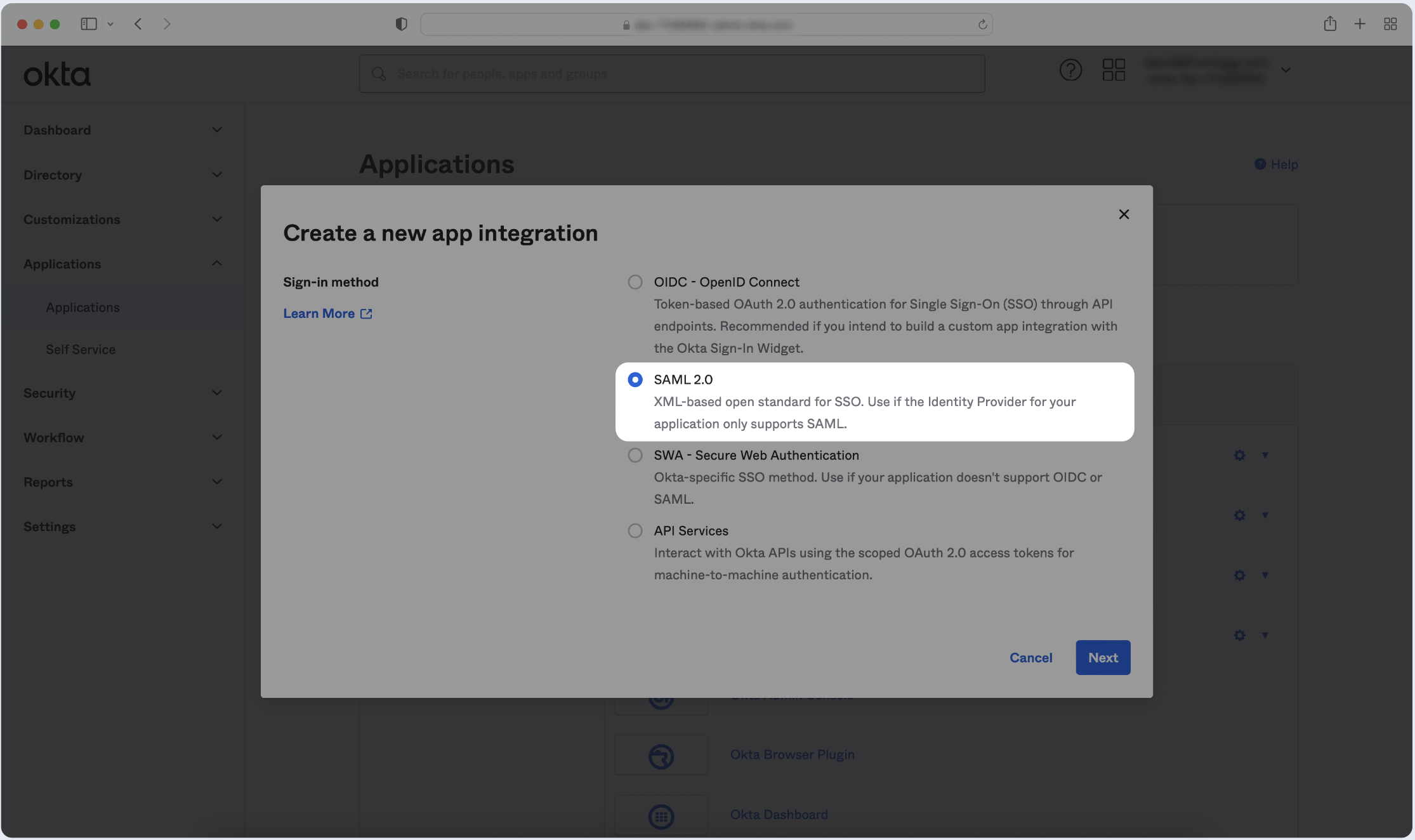 Click Create New App and choose SAML 2.0 as the Sign-in method. Then, click Next.