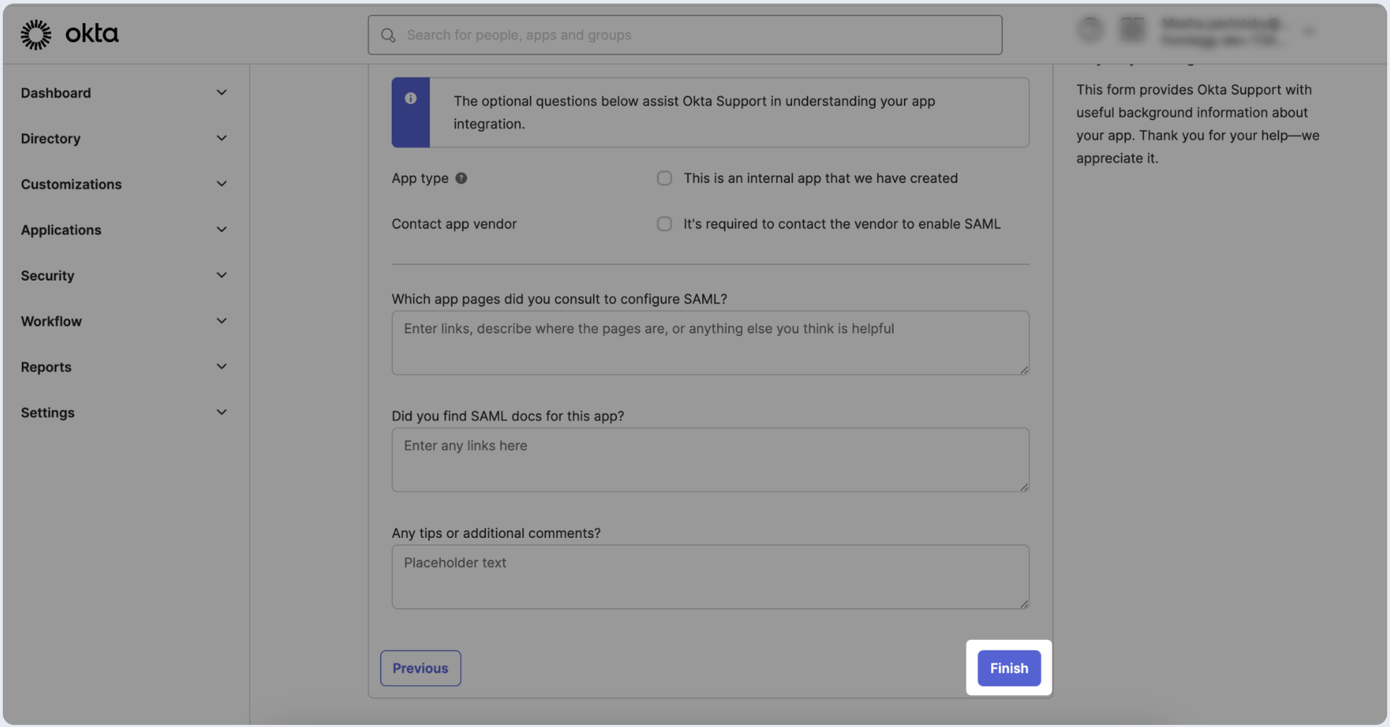 To complete the app creation process, proceed to the next page and skip or fill out the survey. Click on Finish.